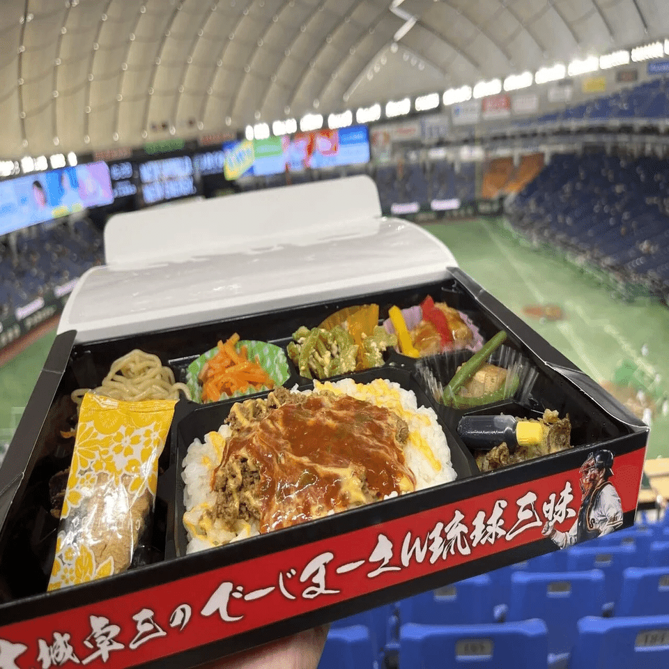今日の観戦のテーマはキャッチャー。だから球場メシは『大城卓三のでーじまーさん琉球三昧』1,800円。セレブ価格の晩ごはん。昼メシは抜いてきた。タコライス、沖縄塩焼きそば、ラフテー(豚角煮)いんげん添え、ゴーヤーチャンプルー、紅芋コロッケ、もずく天ぷら、ちんすこうなど。どれもgoodだけど、ちんすこうが一番美味かったりして。