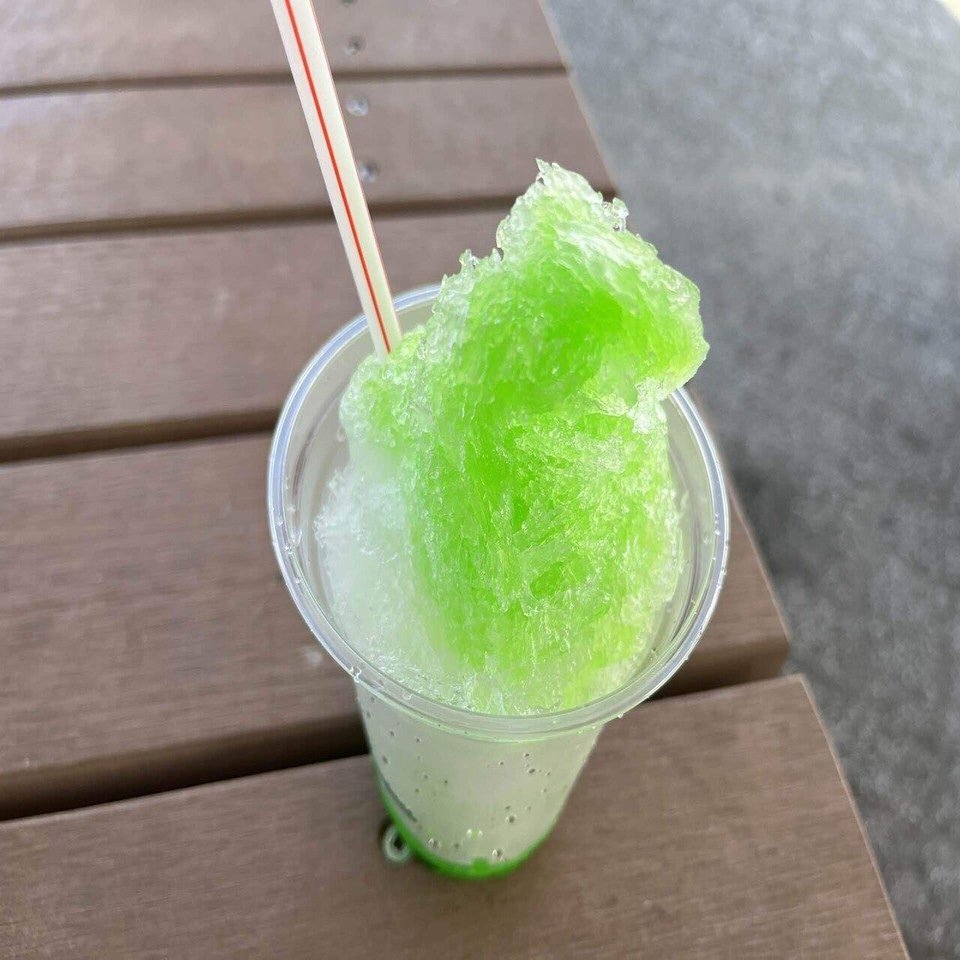 メロンのカキ氷。ソフトドリンクがないので水分代わりにする。モツ煮込みと合わせた千円。豪華なランチになった。