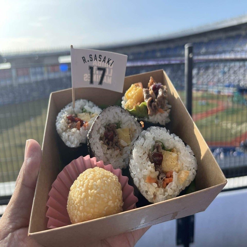 朗希の和牛のり巻きBOX、1000円。佐々木朗希の好きな具材だけを集めたらしいが作り置きの冷房。これはイマイチ。
